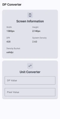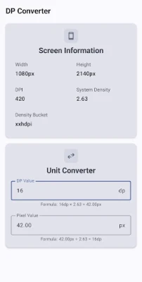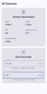 A must-have tool for Android developers and UI designers! Instantly convert between Density-independent Pixels (DP) and Pixels (PX) with real-time device information.