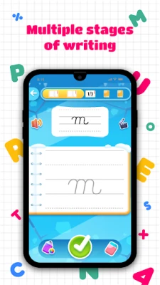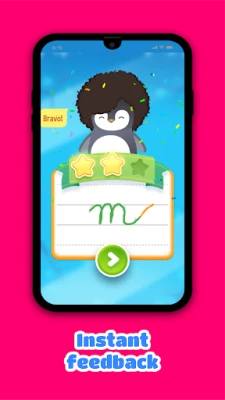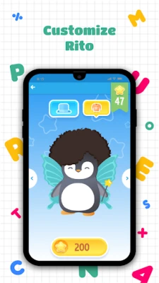 Children are accompanied on their writing learning adventure by the cute penguin Rito. ๐ง Rito is with the children every step of the way with audio encouragement, rewards, and visual suggestions to improve handwriting. The stars earned from completed exercises can be used to personalize the penguin with different costumes and hats. To ensure an authentic learning experience, stars can only be earned after practice, and cannot be purchased. In addition, for each letter learned (small + capital), children are rewarded with a drawing template containing the specific letter. Children can relax by connecting the dots and colouring in the resulting drawing. ๐จ